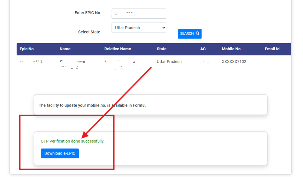 - उसके बाद आपके मोबाइल पर एक ओटीपी जायेगा उस ओटीपी को आपको भरकर सबमित पर क्लिक कर देना है। जैसे ही आप ओटीपी को वेरिफाई करेंगे तुरन्त आपके सामने Voter ID Card डाउनलोड करने का आप्शन मिल जायेगा। उस पर क्लिक करके आप अपना वोटर आईडी डाउनलोड कर सकते है।