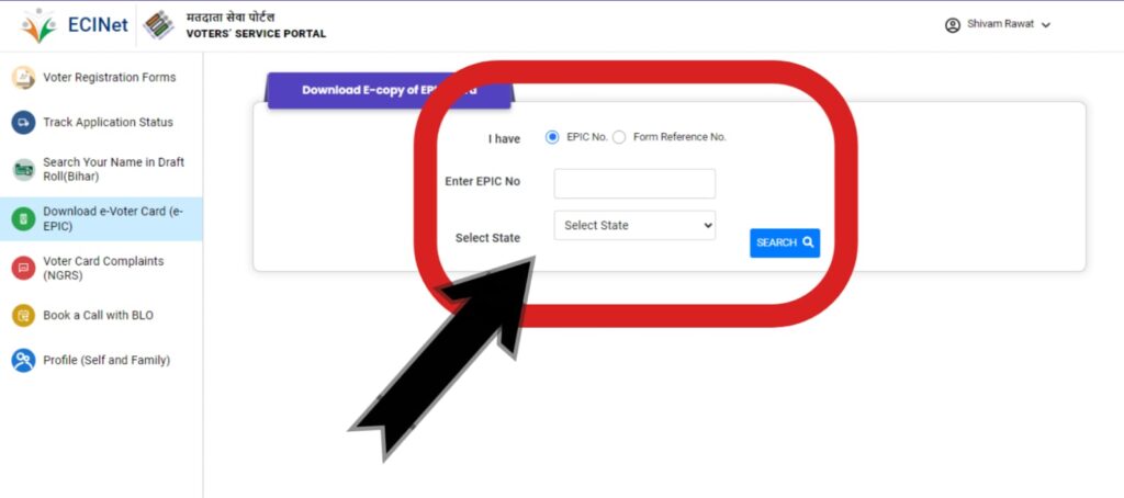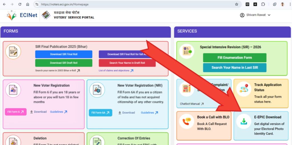 - जब आप लॉगिन हो जायेंगे तब आप नीचे दिये गई फोटो के जैसे आपका स्क्रीन दिखाई देखा। वहां पर आपके नीचे दाहिने कोने में एक आप्शन E-EPIC Download देखने को मिल जायेगा। उस पर आपकों क्लिक कर देना है।