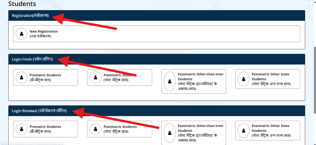 अगर आप नवीन यानी फ्रेस स्टूडेन्ट है यानि आपने अपना आवेदन पहली बार किया है तो आप नवीन वाले सेक्शन से ऑप्सन को चुनना होगा। और अगर आपने इससे पहले आवेदन किया था और इस बार आपने रिन्यूवल कराया है तो आपको नवीनीकरण लॉगिन पर क्लिक करना है।